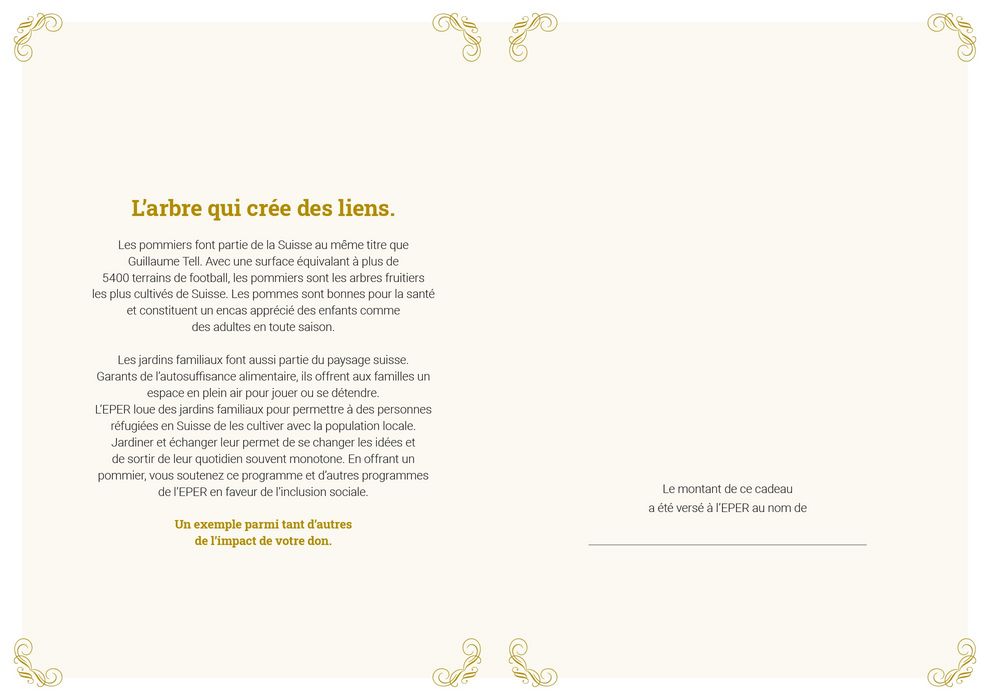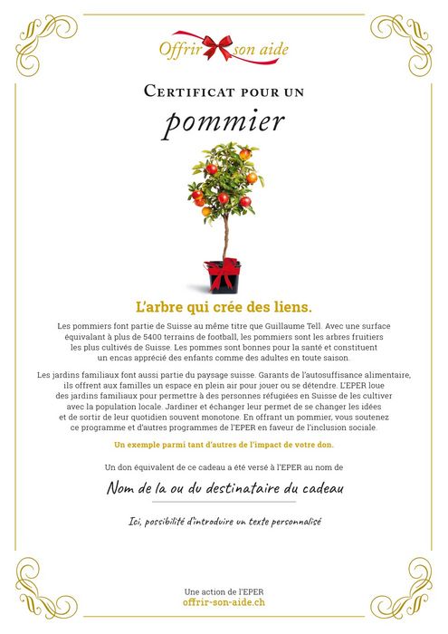 Les jardins familiaux font aussi partie du paysage suisse. Garants de l’autosuffisance alimentaire, ils offrent aux familles un espace en plein air pour jouer ou se détendre. L’EPER loue des jardins familiaux pour permettre à des personnes réfugiées en Suisse de les cultiver avec la population locale. Jardiner et échanger leur permet de se changer les idées et de sortir de leur quotidien souvent monotone. En offrant un pommier, vous soutenez ce programme et d’autres programmes de l’EPER en faveur de l’inclusion sociale.
