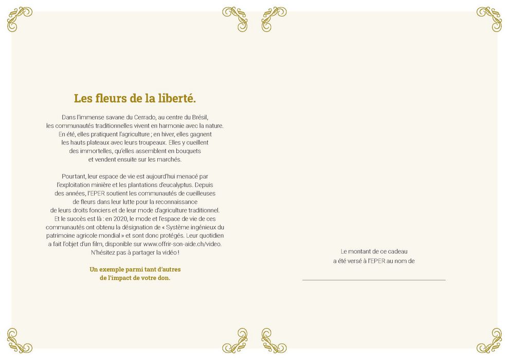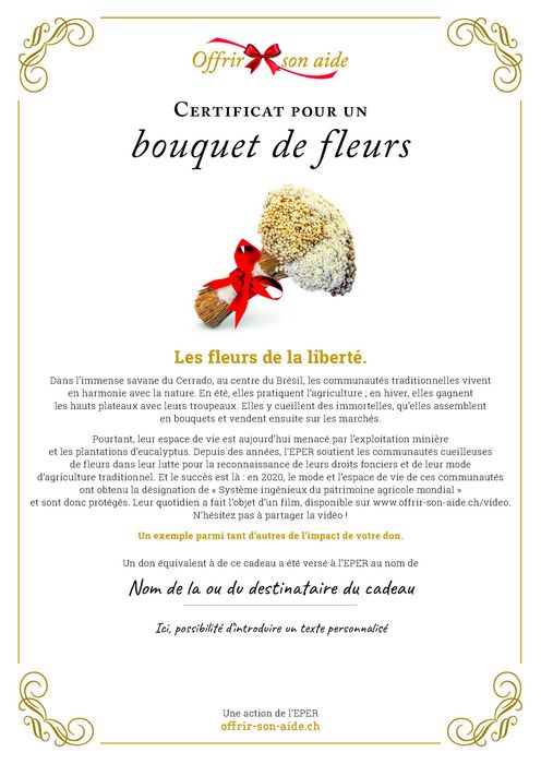 Pourtant, leur espace de vie est aujourd’hui menacé par l’exploitation minière et les plantations d’eucalyptus. Depuis des années, l'EPER soutient les communautés de cueilleuses de fleurs dans leur lutte pour la reconnaissance de leurs droits fonciers et de leur mode d’agriculture traditionnel. Et le succès est là : en 2020, le mode et l’espace de vie de ces communautés ont obtenu la désignation de « Système ingénieux du patrimoine agricole mondial » et sont donc protégés. Le quotidien des cueilleuses et des cueilleurs de fleurs a fait l’objet d’un film, disponible sur www.offrir-son-aide.ch/video. N’hésitez pas à partager la vidéo !