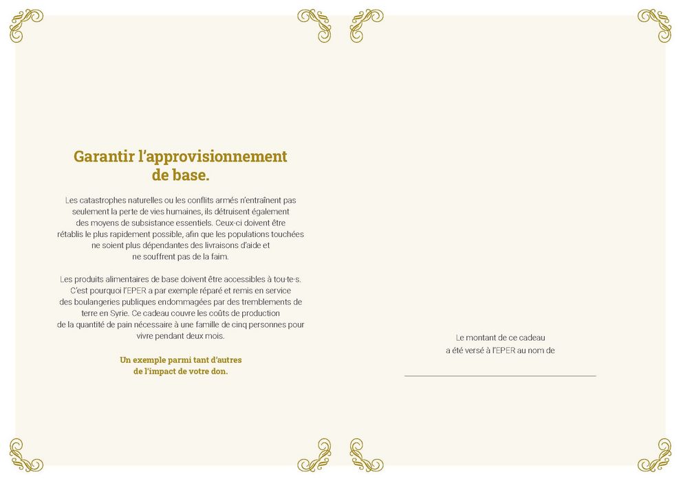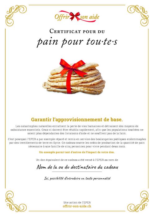 Les produits alimentaires de base doivent être accessibles à tou·te·s. C’est pourquoi l’EPER a par exemple réparé et remis en service des boulangeries publiques endommagées par des tremblements de terre en Syrie. Ce cadeau couvre les coûts de production de la quantité de pain nécessaire à une famille de cinq personnes pour vivre pendant deux mois.