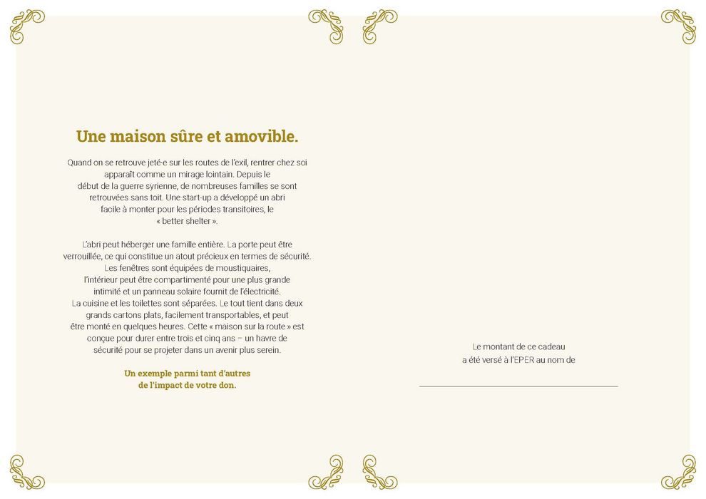 En fonction du cadeau choisi, votre don est reversé à l’un des cinq fonds de l’EPER, chacun ayant un but bien précis.