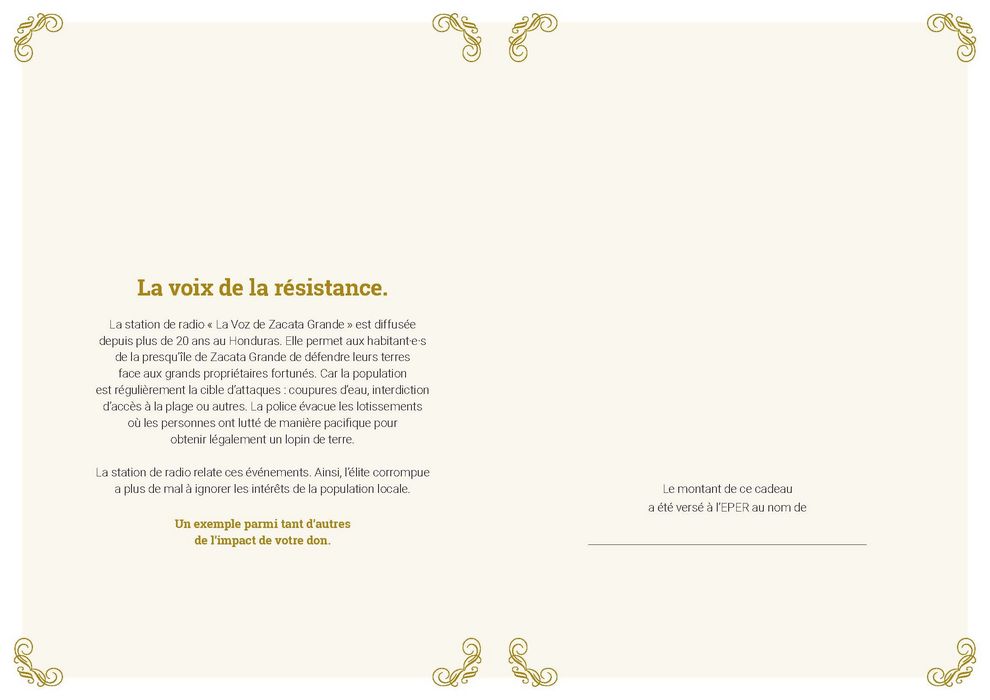 En fonction du cadeau choisi, votre don est reversé à l’un des cinq fonds de l’EPER, chacun ayant un but bien précis.