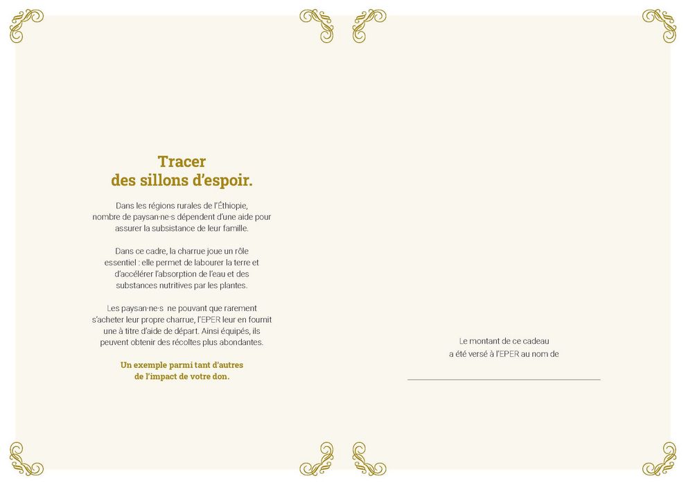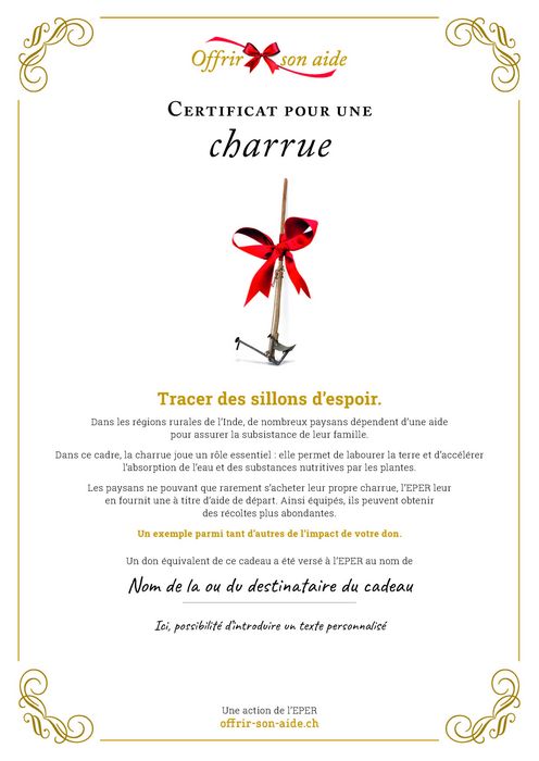 Dans les régions rurales de l’Inde, de nombreux paysans dépendent d’une aide pour assurer la subsistance de leur famille. Dans ce cadre, la charrue joue un rôle essentiel: elle permet de labourer la terre et d’accélérer l’absorption de l’eau et des substances nutritives par les plantes. Les paysans ne pouvant que rarement s’acheter leur propre charrue, l’EPER leur en fournit une à titre d’aide de départ. Ainsi équipés, ils peuvent obtenir des récoltes plus abondantes.