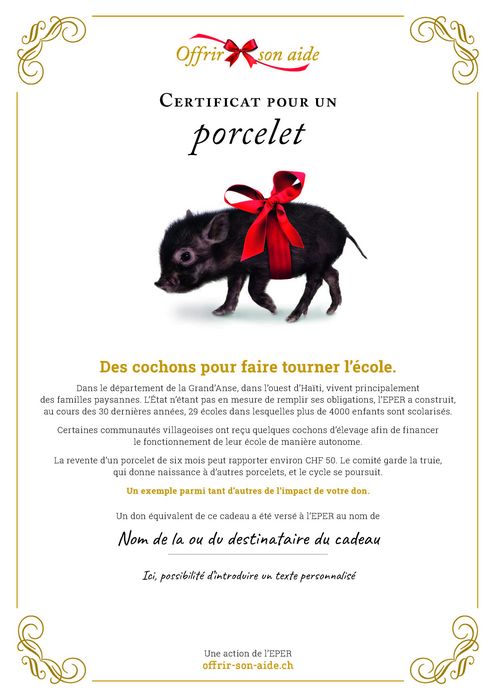Ce sont principalement des familles de petits paysans qui vivent dans le département de la Grand’Anse, à l’ouest d’Haïti. L’Etat ne remplissant pas ses obligations, l’EPER a construit, au cours des 30 dernières années, 29 écoles dans lesquelles plus de 4000 enfants sont scolarisés. Certaines communautés villageoises ont reçu quelques cochons d’élevage afin de financer le fonctionnement de leur école de manière autonome. La revente d’un porcelet de six mois peut rapporter dans les 50 francs. Le comité garde la truie qui donne naissance à d’autres porcelets et le cycle se poursuit.