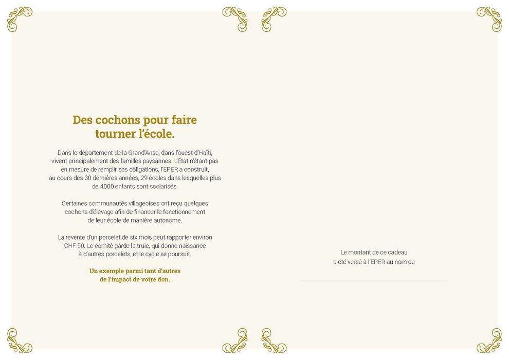 En fonction du cadeau choisi, votre don est reversé à l’un des cinq fonds de l’EPER, chacun ayant un but bien précis.