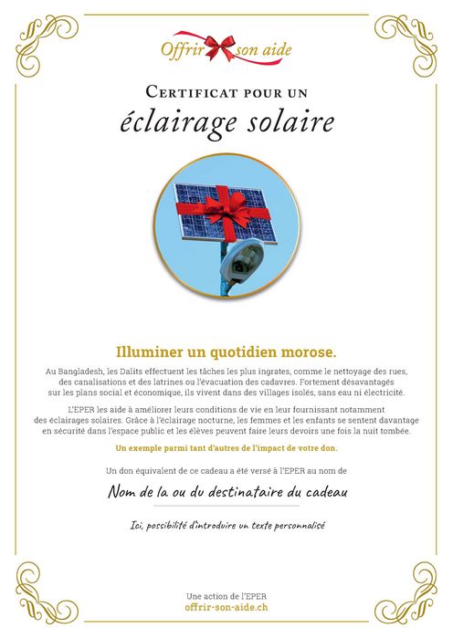Au Bangladesh, les Dalits effectuent les tâches les plus ingrates, comme le nettoyage des rues, des canalisations et des latrines, ou l’évacuation des cadavres. Fortement désavantagés sur le plan social et économique, ils vivent dans des villages isolés, sans eau ni électricité. L’EPER les aide à améliorer leurs conditions de vie en leur fournissant notamment des éclairages solaires. L’éclairage nocturne augmente la sécurité des femmes et des enfants et permet aux écolières et écoliers de faire leurs devoirs une fois la nuit tombée.