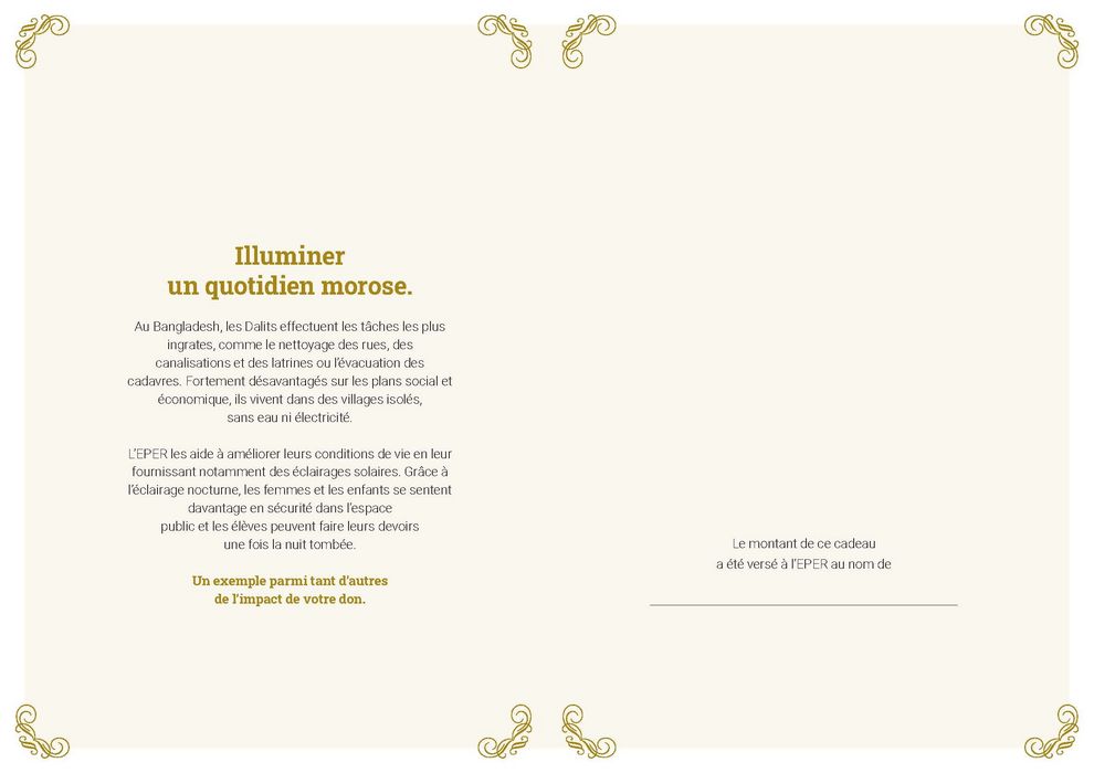 En fonction du cadeau choisi, votre don est reversé à l’un des cinq fonds de l’EPER, chacun ayant un but bien précis.
