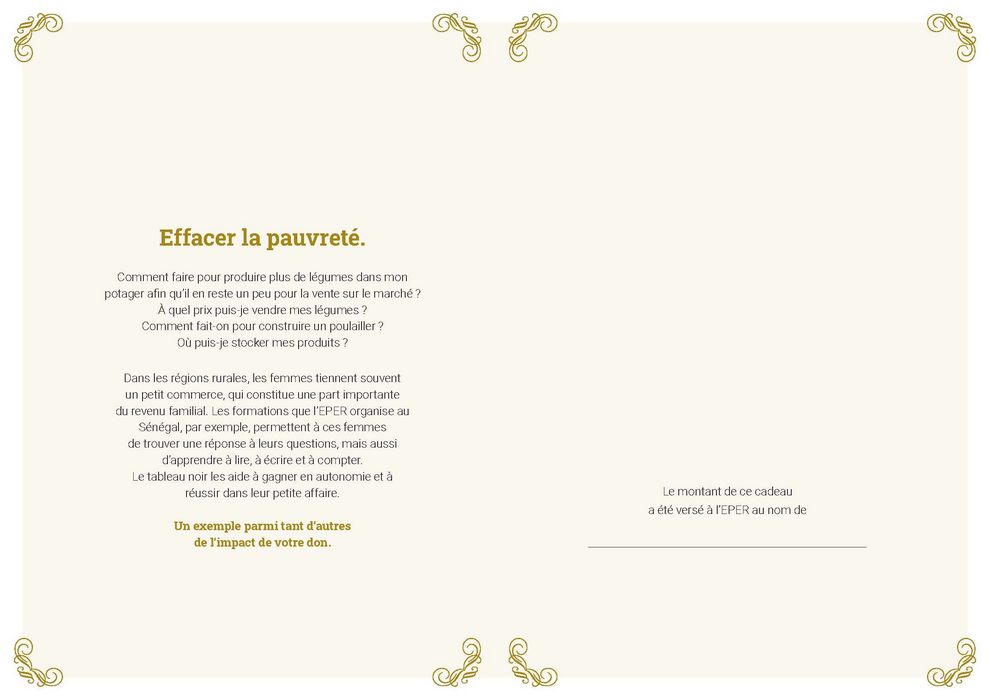 En fonction du cadeau choisi, votre don est reversé à l’un des cinq fonds de l’EPER, chacun ayant un but bien précis.