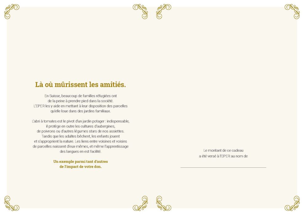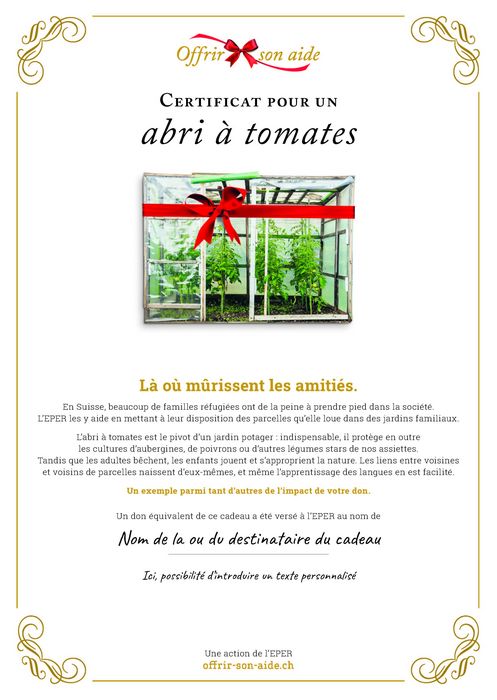 En Suisse, beaucoup de familles de réfugiés ont de la peine à prendre pied dans la société. L’EPER les y aide en mettant à leur disposition des parcelles qu’elle loue dans des jardins familiaux. L’abri à tomates est le pivot d’un jardin potager : indispensable, il protège en outre les cultures d’aubergines, de poivrons et autres légumes appréciés dans nos assiettes. Tandis que les adultes bêchent, les enfants jouent et s’approprient la nature. Les liens entre voisins de parcelles naissent d’eux-mêmes, et même l’apprentissage des langues en est facilité.