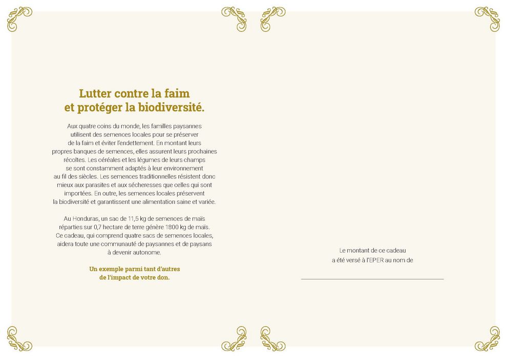 Au Honduras, un sac de 11,5 kg de semences de maïs réparties sur 0,7 hectares de terre génère 1800 kg de maïs. Ce cadeau qui comprend quatre sacs de semences locales aidera toute une communauté de paysannes et de paysans à devenir autonome.