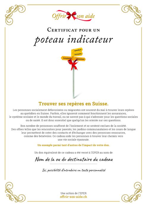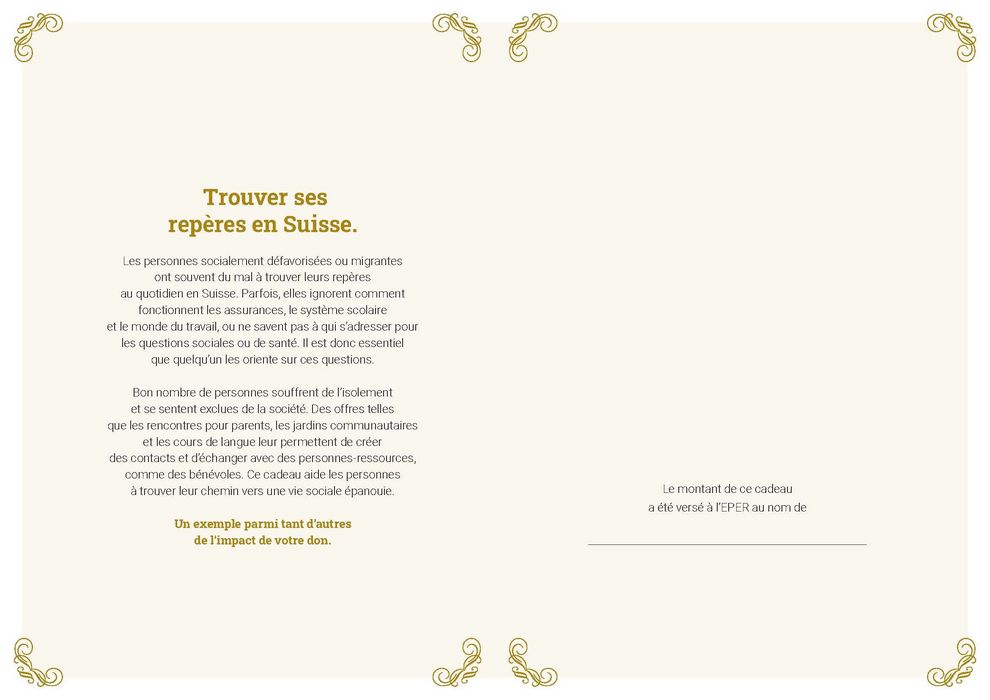 Bon nombre de personnes souffrent de l’isolement et se sentent exclues de la société. Les offres telles que les rencontres pour parents, les jardins communautaires et les cours de langue leur permettent de créer des contacts et d’échanger avec des personnes-ressources, comme des bénévoles. Ce cadeau aide les personnes à trouver leur chemin vers une vie sociale épanouie.